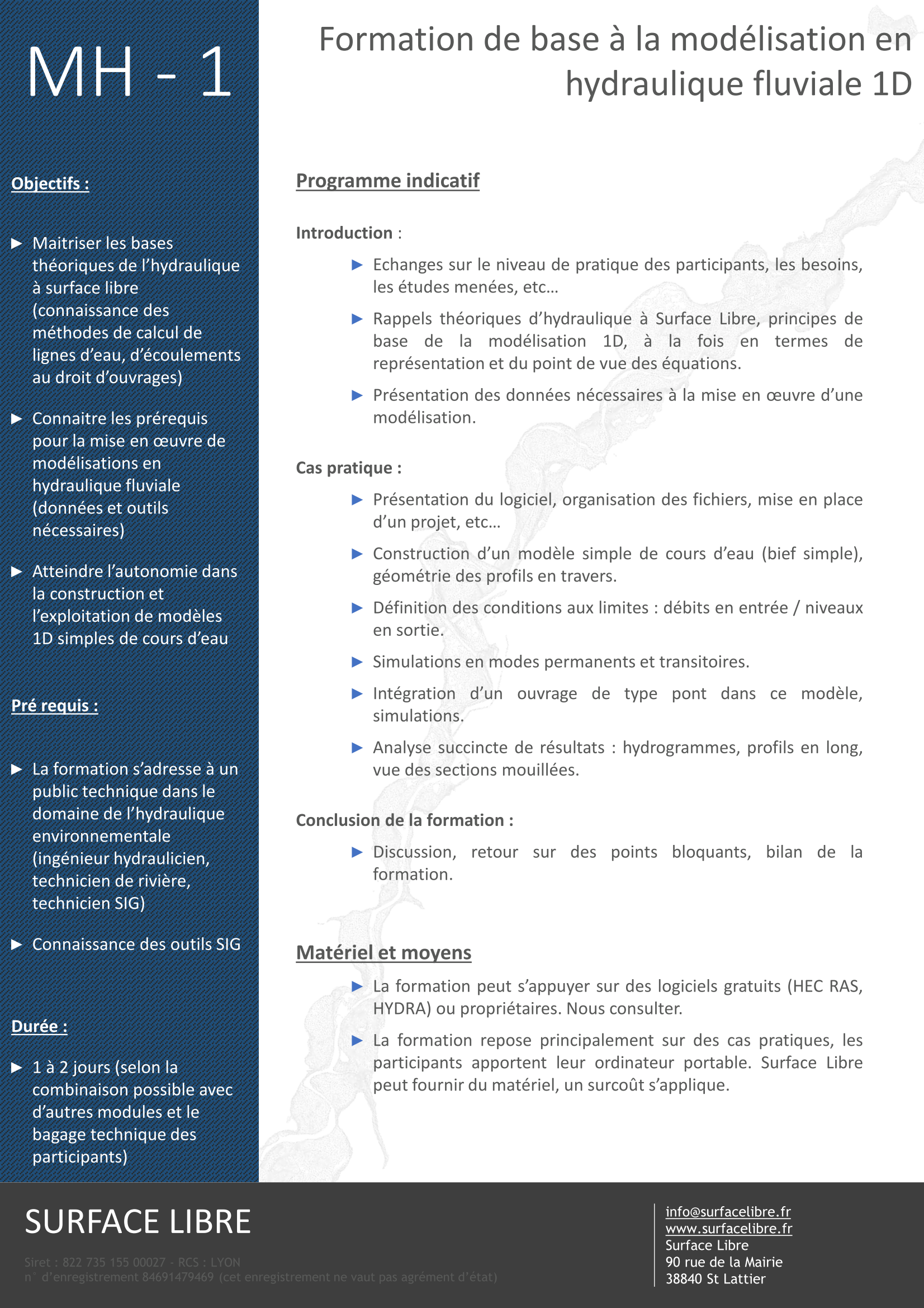 Nous proposons des prestations de formation1 intra-entreprise ou groupées, sur un ou plusieurs jours, sur site ou à distance, sur les thématiques liées aux études d'hydraulique fluviale et urbaine.